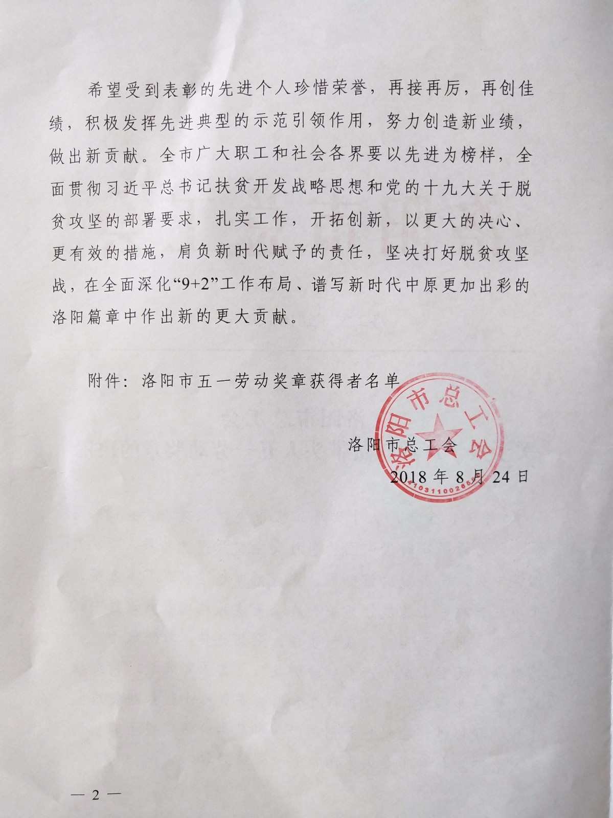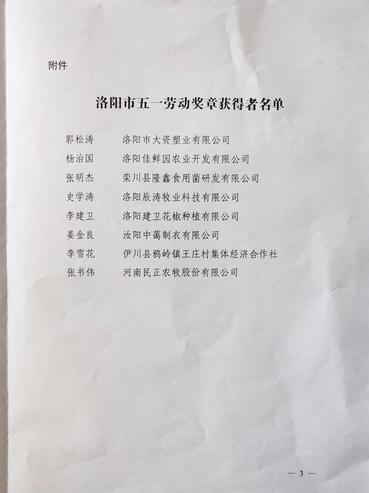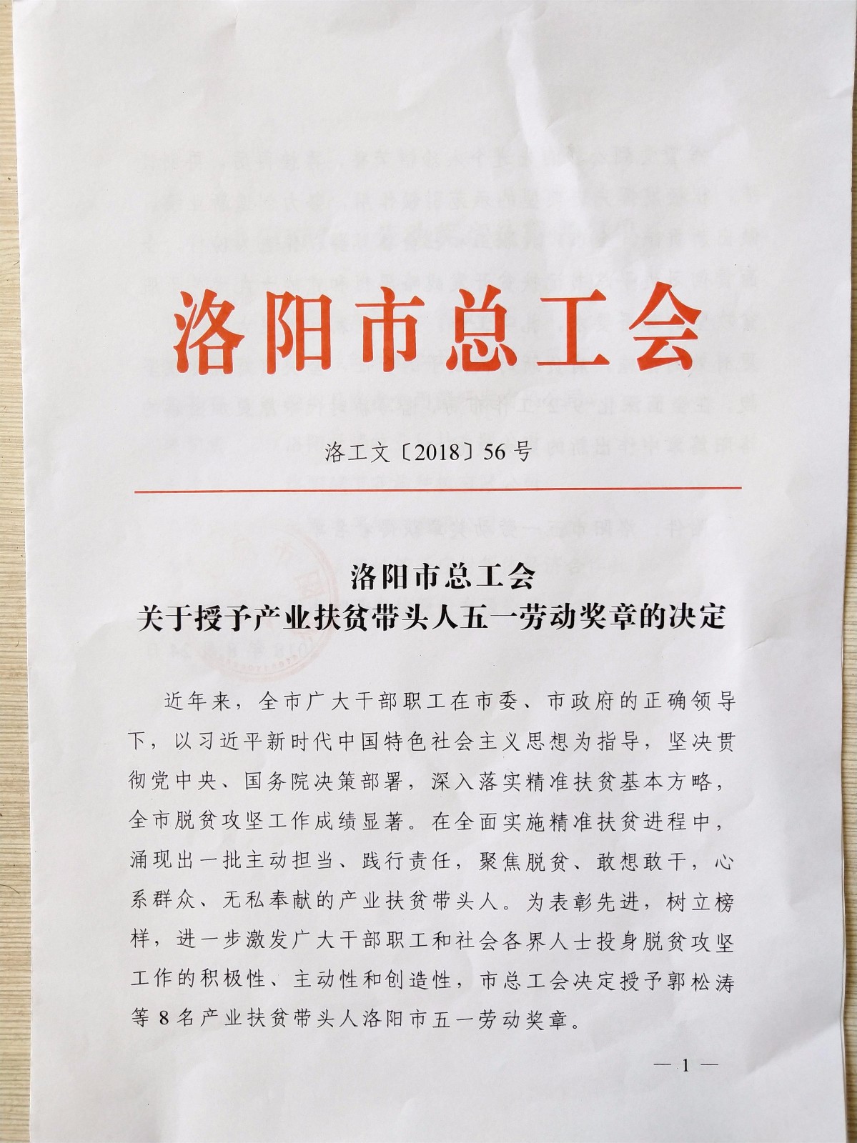 《洛陽市總工會關于授予產業扶貧帶頭人五一勞動獎章的決定》(洛工文﹝2018﹞56號)文件通知:河南民正農牧股份有限公司張書偉董事長被洛陽市總工會授予“洛陽市五一勞動獎章”。